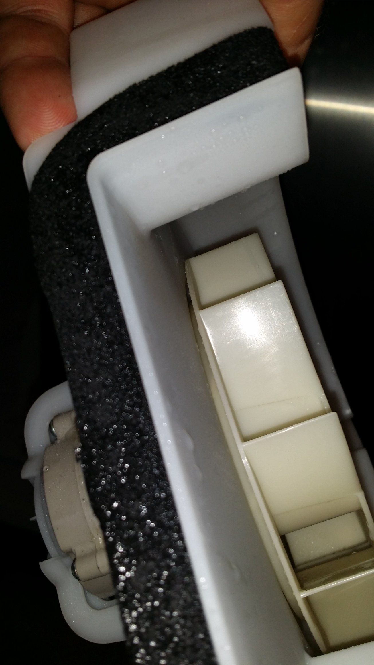 On inspection of the fan assembly, I found that the ice build-up had caused the fan to bend slightly into a position where it was now very lightly brushing against the back panel, causing the noise.